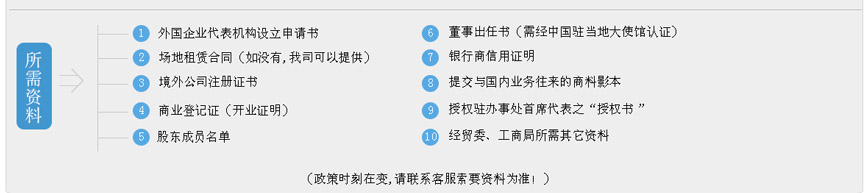 1、外國(地區(qū))企業(yè)有權簽字人簽署的《外國(地區(qū))企業(yè)常駐代表機構設立登記申請書》(原件1份);